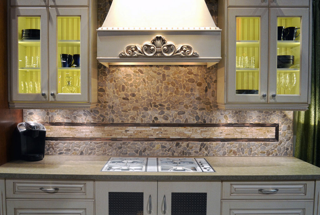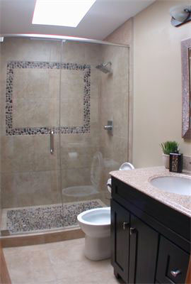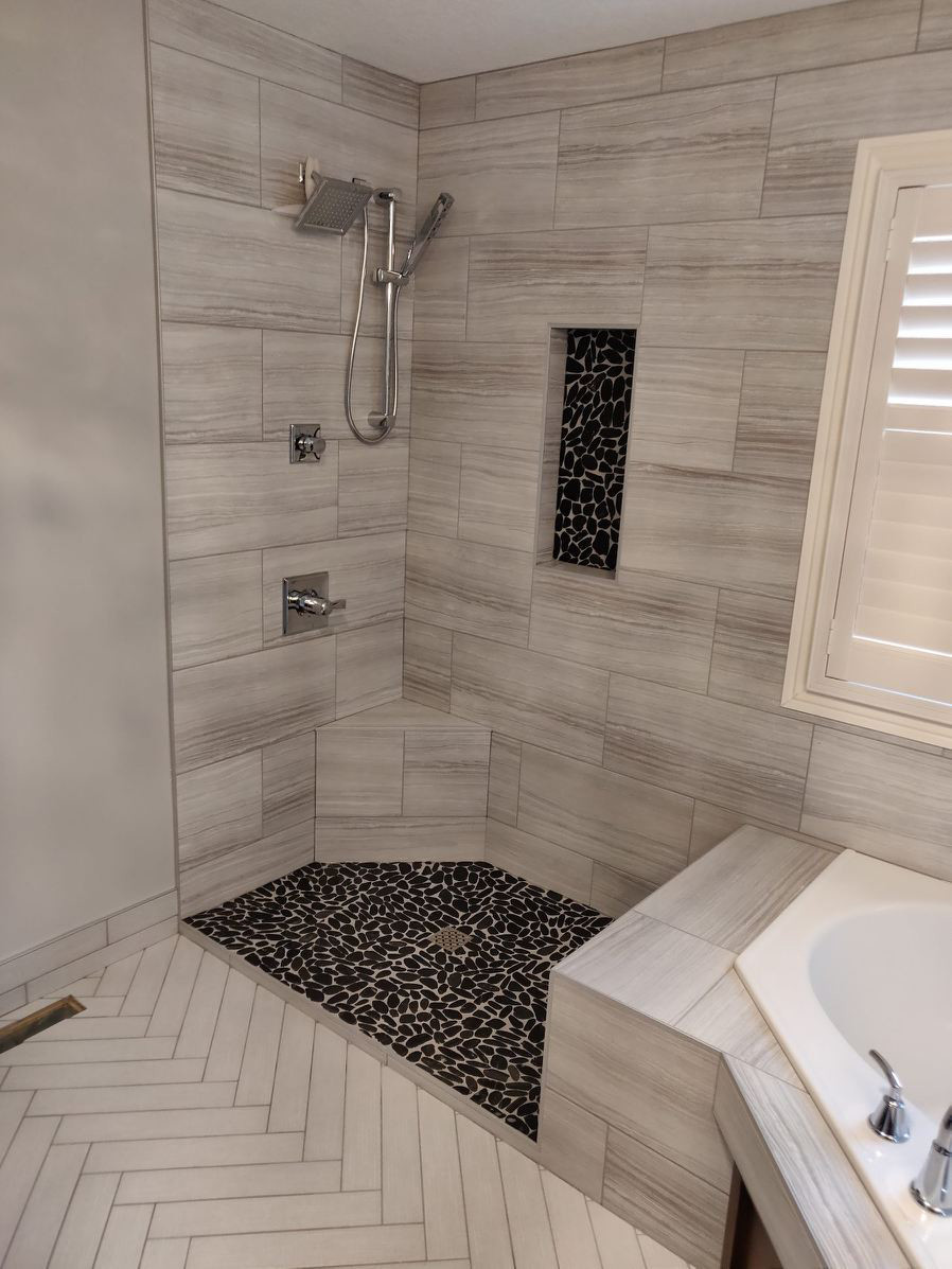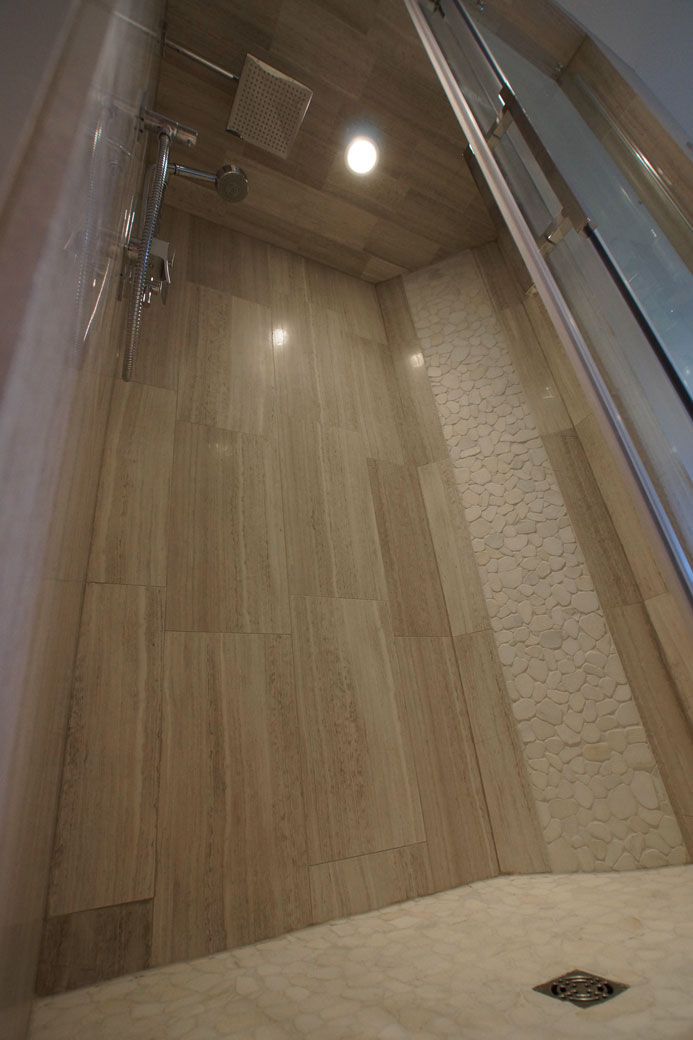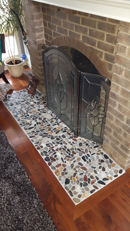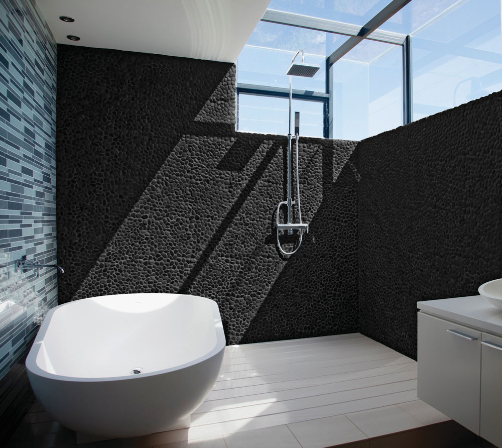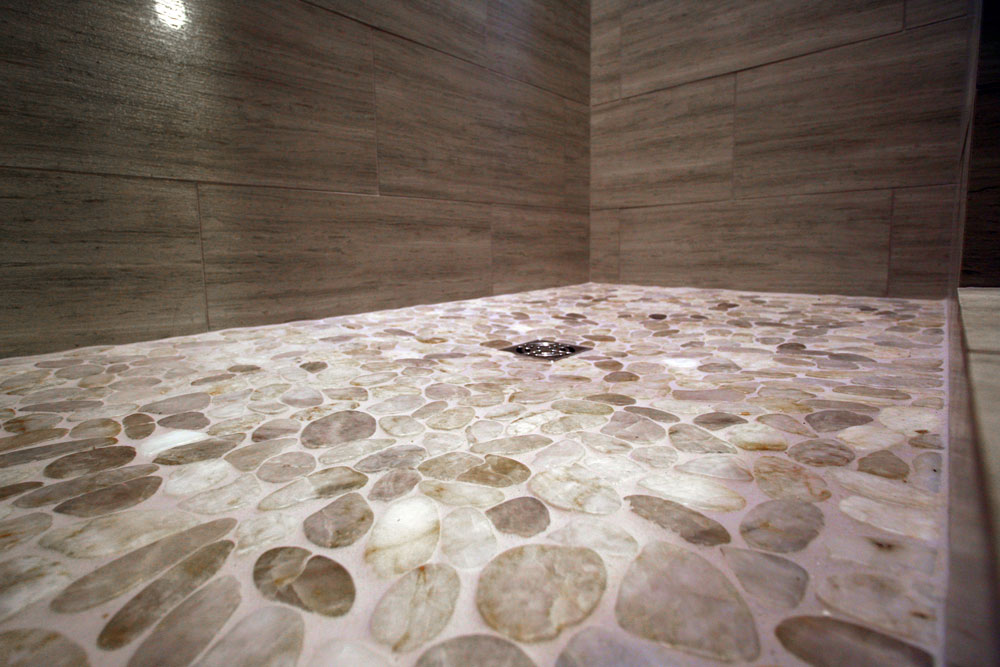 Each small format pebble is secured on a mosaic, which is ideal for curved or graded surfaces such as a shower base. When the small nooks are all filled with grout, this mosaic boasts extremely high traction.