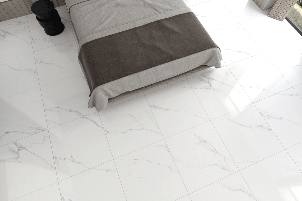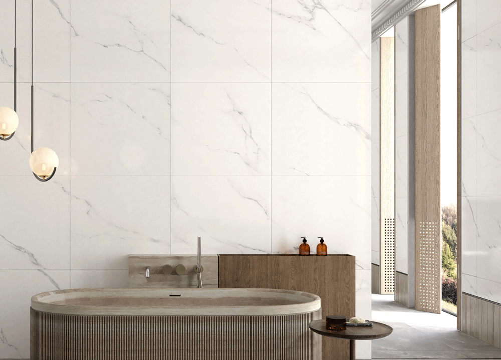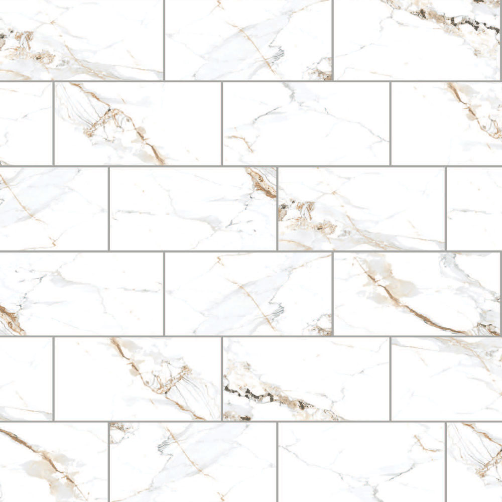 Two unique marble looks: One with muted, subtle veins, and another with bold golden accents. The porcelain tile in the Bering collection leaves a lasting impression at an unbeatable price