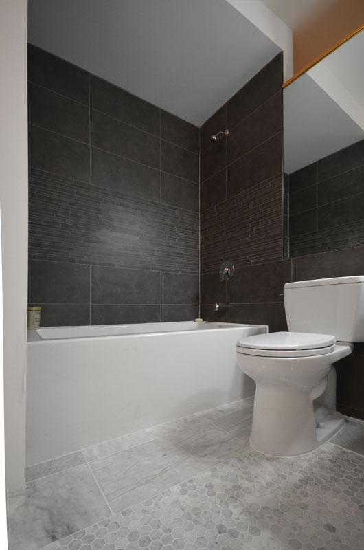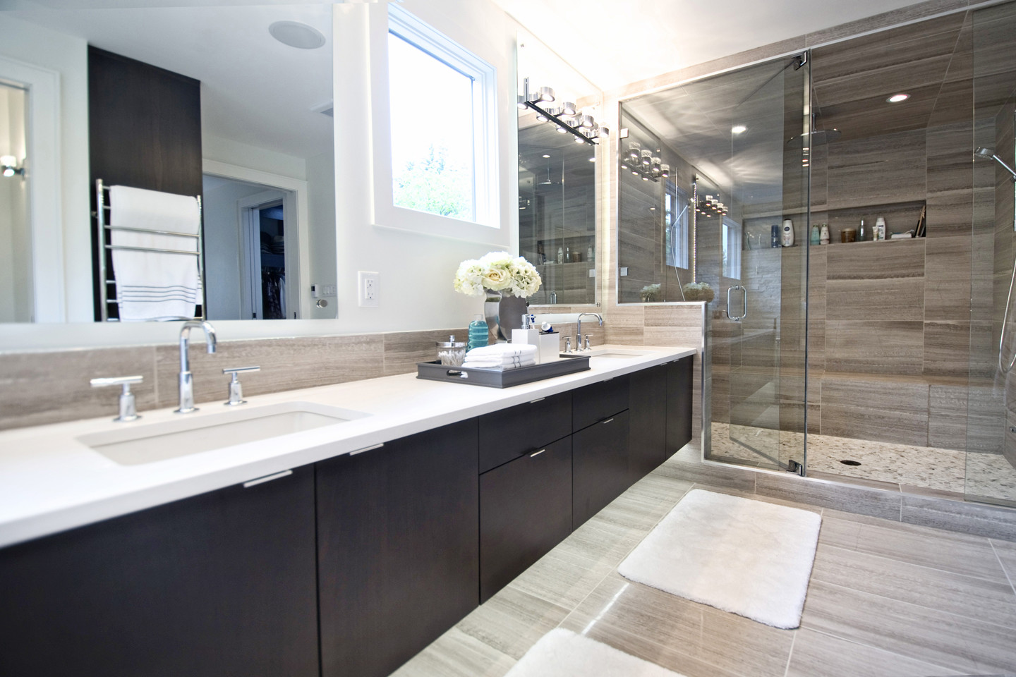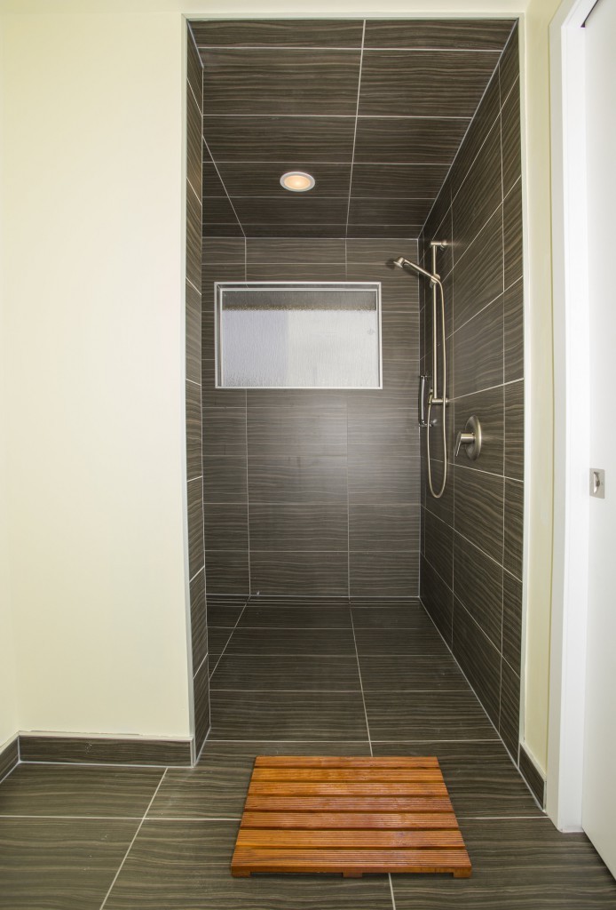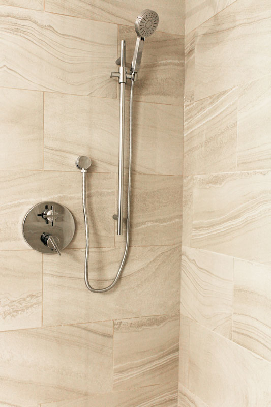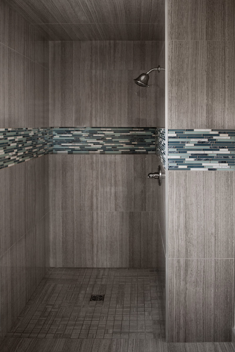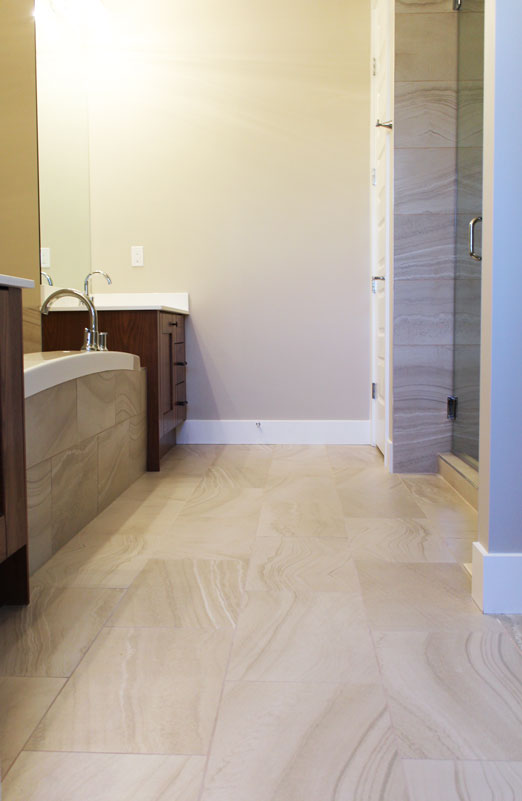 The repetition of the tile on the floor and walls creates a subtle, calming affect, contributing to a spa-like feel.