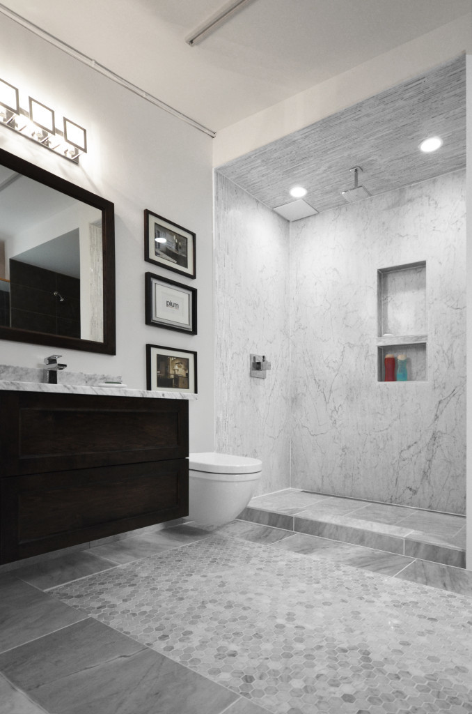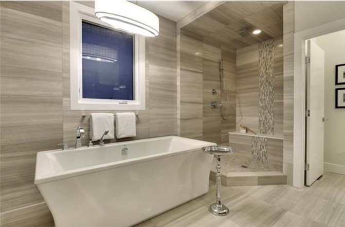 The answer is vague, and one of personal preference; however, this month let’s take a look at putting the same tile on the floor and walls, and I’ll throw in some options on varying texture and colour to create interest with the same stone or porcelain tile throughout.